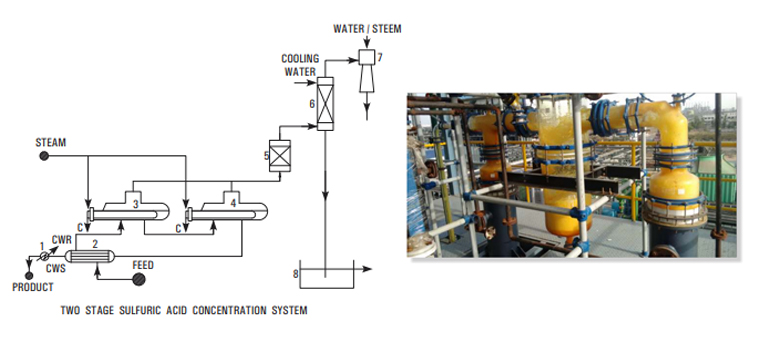 The process is extremely simple & involves concentration of dilute sulfuric add by evaporation using steam/thermic fluid as heating media under vacuum. The dilute feed is preheated & fed to a series of evaporators in stages to achieve the concentration level. The vapors from the evaporators are condensed and drained out through barometric legs and non-condensables are removed by an ejector. The final product is cooled and drawn in the storage tank.