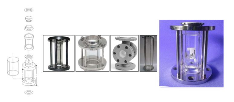 A sight glass consists of one glass pipe section, one metal frame, a pair of PTFE bushes and washers and an acrylic cover. Borosilicate pipe section is highly heat resistant, has excellent chemical resistance and has low thermal expansion. Metal frame is composed of two flanges which are welded with studs so that the stresses and vibrations of the pipeline do not transfer to the glass pipe section. Its check nut keeps the glass pipe section in compression and provides ease in replacement