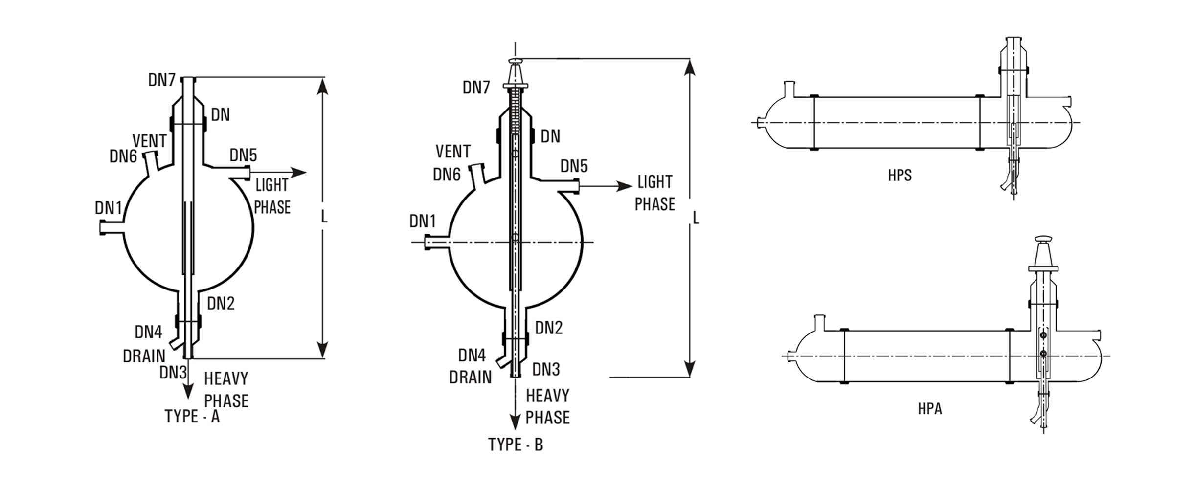 | Cat.Ref. | Nominal Capacity | L | DN | Inlet DN1 | DN2 | Heavy Phase Outlet DN3 | Drain DN4 | Light Phase Outlet DN5 | Vent DN6 | DN7 | Type |